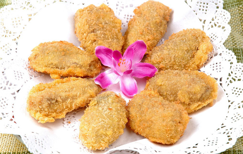 炸鸡翅: 鸡翅500克、“炒焗佐料精”6克、酱油、白糖、盐. 葱和芹菜段搭配后分一半腌制鸡翅10分钟。另一半配料与面粉30克、生粉60克搅水25克加鸡蛋1个、然后醮鸡翅下油锅慢火炸熟。