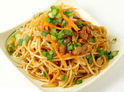 炒面条、粉条: 面条1公斤、“炒焗佐料精”7克、虾、 肉、鸡蛋、盐、葱或韭莱段少量搭配。