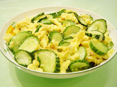 5. 投入黄瓜片,同鸡蛋一起炒匀,烹入料酒,加少许水;