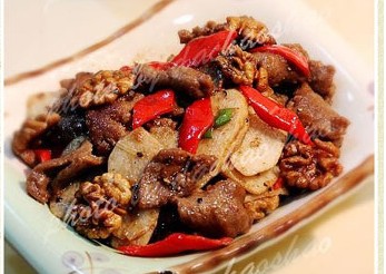 鲜核桃仁60克、红椒片40克。