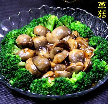 5、把草菇最后调好味后用适量水淀粉勾芡,待芡汁糊化后便可出锅,然后把烧好的草菇盛入事先摆放好西兰花的盘中便可上桌食用。