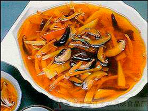 【原料】香菇25克,竹笋15克,金针110克,姜5克,金鸣调味料1克,精盐3克,清汤300克。