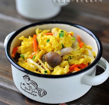 鸡蛋3个、各种新鲜的菌菇150g、胡萝卜半根、葱花一小把、调味料。