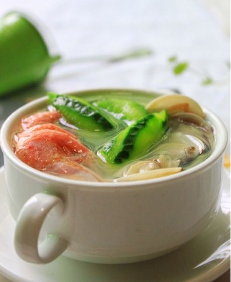 原料:丝瓜一条,蛤蜊400克,北极虾十只,盐少许 水适量,油几滴、调味料。