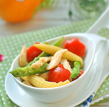 6、芦笋和玉米笋在飞水中烫熟。再切成段。