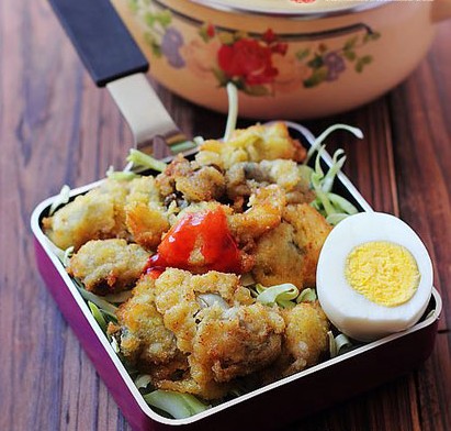 4、锅里油加热,油七成热的时候,将海蛎下锅炸,炸至金黄酥脆即可出锅,将海蛎子铺在包菜丝的上面,吃的时候蘸番茄酱或是沙拉酱即可。