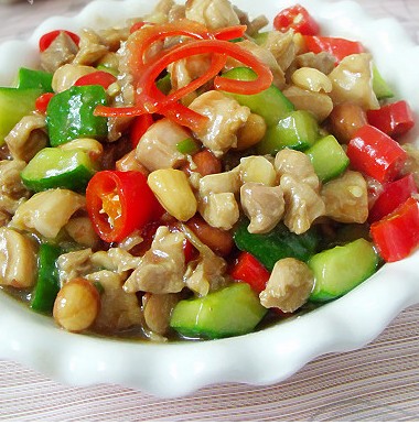 原料:去皮鸡腿 适量、 黄瓜 适量 、熟花生米 适量、 红辣椒适量、 花椒 适量 、干红辣椒 适量 、葱姜蒜末 适量 、盐 适量、 生抽 适量 、料酒 适量 、淀粉、 适量、 胡椒粉、 适量 、香油、 适量 、蚝油 适量、 味精 适量、调味料适量。