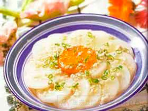 原材料: 鸡肉30克、白萝卜200克、红萝卜10克、葱2克。