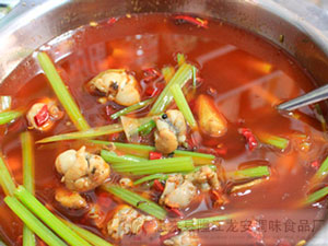 (4)炒锅置炉上,下油加热,放豆瓣,姜片,葱,花椒,干辣椒,炒香并呈红色,放牛蛙肉,整蒜子,冰糖,炒酥,掺红汤,下金鸣调味料,味多宝,胡椒粉,料酒,烧沸,出尽浮沫,倒入盛有青笋,茭白,白萝卜的火锅盆,上台即可。